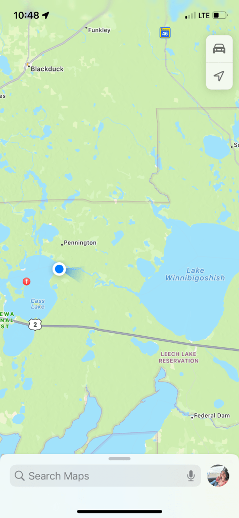 Location during our breakdown and recovery (red pin is where we started the day on route to Lake Winnibigoshish