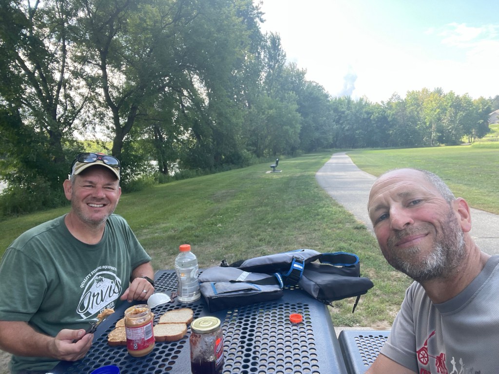 We planned today to be a short one on the water with all the errand running, and we wanted to get some fishing in. Knowing Chad and I won’t make it to the twin cities, and Christin will pick us up further north and skip over some miles has allowed us to expect more enjoyment. We traveled 12 miles to Crow Wing state park, where they had showers. I showered first in my clothes to act as a pseudo washing machine, which seemed functional enough to get a few more days out of some shirts. (You may have notice my limited wardrobe in the photos so far.) Chad tried some fishing with no luck (though he said he had his lures on frontways); I tried to catch up on this blog (I’m now 3 days in arrears).
