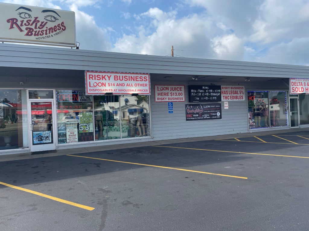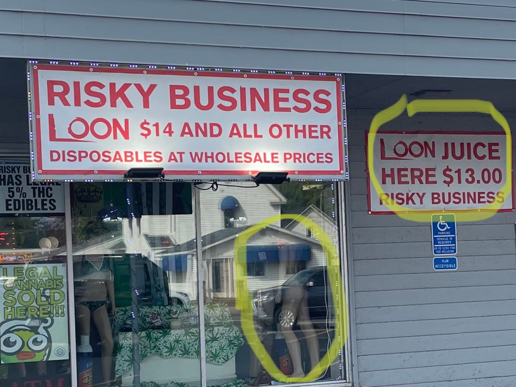 Then two blocks before I was to make my descent from the civilized surface to the waterway below, I was stopped in my tracks by the Risky Business establishment. I was gobsmacked to see now the source of the loonatic problem, these guys were selling “juice” targeted at loons! Not only that, the display in the front window had human replicas to show the loons the soft spots to address humans with their pointy beaks. They had a fully naked manikin which I imagine is the one that is most popular with the proprietor and his clientele. It seemed the store was not yet open, so I high-tailed back to the boats so Chad and I could escape before things got loony ugly.