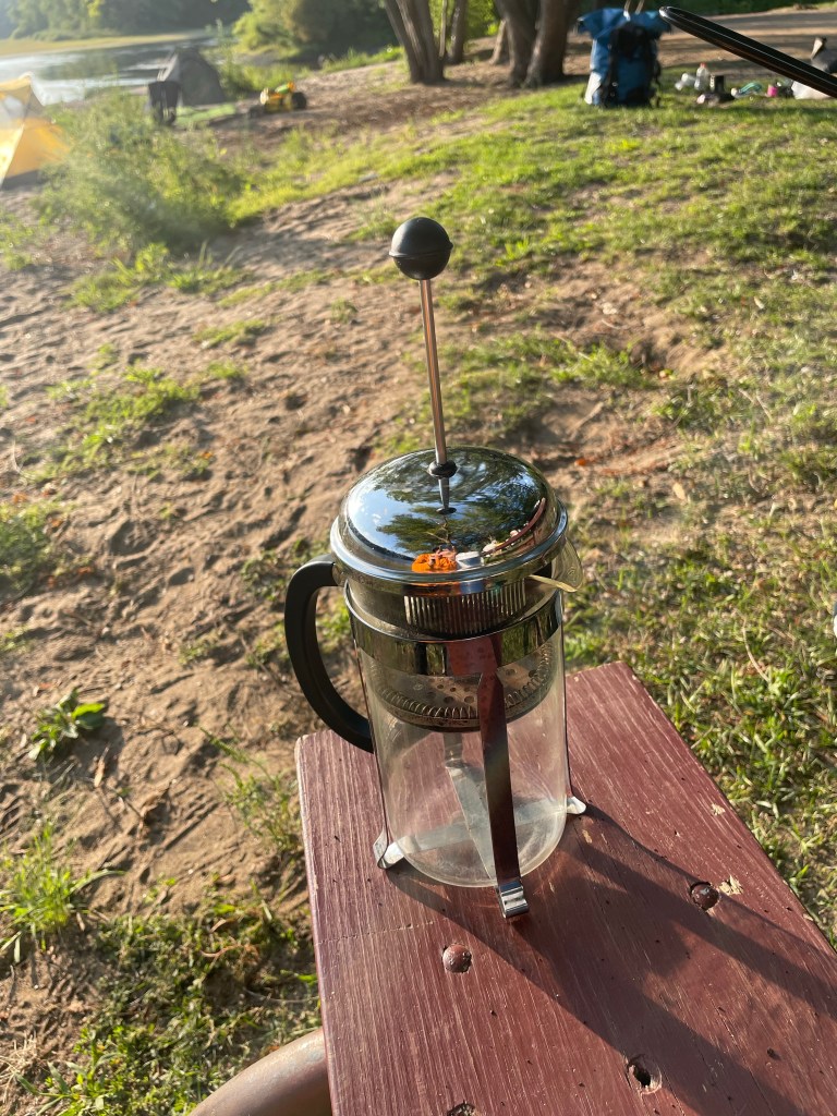 This morning we awoke to no surprises. No Brainerd police, no river pirates, no dam workers. One lonely angler wandered by as we were breaking down camp, and he wished us well on our journey. We made coffee by pouring boiling water over coffee grounds in a filter, but it really wasn’t good. We then tried boiling the coffee in the new pot and pouring that through a filter. It was a little better, but made a mess. I miss my French precious! How did they not have a French press at Fleet Farm? They seemed to have everything else; the $400 receipt from everything I bought was as long as my arm (and nearly the apparent circumference, though not the actual circumference, of Chad’s head). Dick’s would’ve had a French precious!