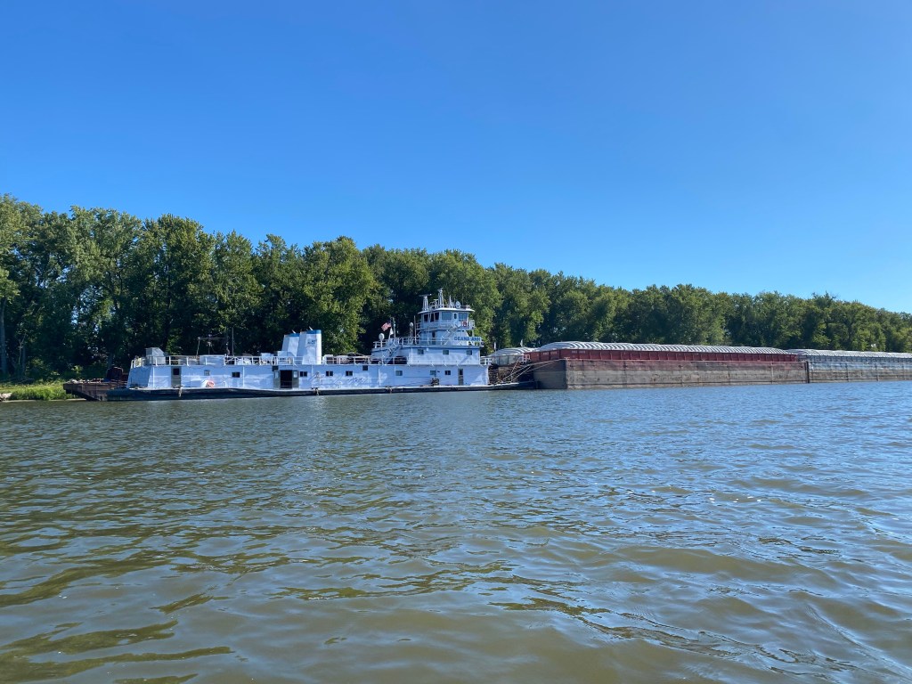 As we were set to depart, our first glimpse of a commercial marine operation appeared. The tow was 3 barges wide and 2 long, a mere baby barge tow, but we were impressed and glad to see what we were going to be up against for the next 1,700 miles. My Findship app told me this was the Aubrey Bharwell, Jr. traveling downriver at 6.1 knots (we wouldn’t be able to outrun her), so we waited for her to pass and moved into her wake.