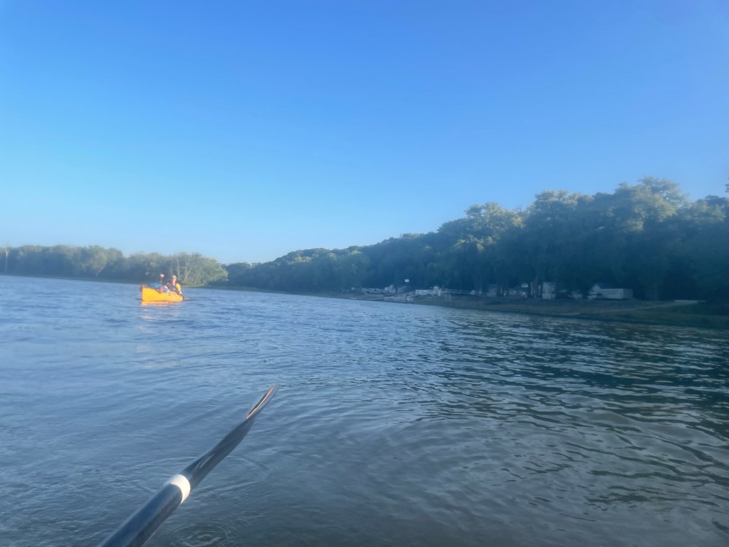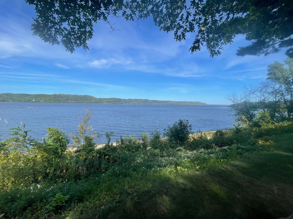As we were leaving Red Wing Minnesota, on the Wisconsin side we saw… the Harbor Bar! There were a few tents on the lawn and there were a lot of picnic tables, umbrellas and a big lawn leading to the river. It looked like a place we could’ve had a cribbage game and gotten into interesting conversations with all sorts of Wisconsinites. But how were we upon this spot already? My spreadsheet showed it should be 10 miles further downstream (though my notes said it was across from Red Wing). Looks like we wouldn’t have a burger and a beer at the Harbor Bar, and we wouldn’t meet Gary. It felt like a slightly deflating missed opportunity. We could’ve easily made it here last night had we known the proximity. Oh well. I looked at the map and found Kelly’s Lakehouse Bar & Grill, 14 miles downstream in Lake City. At our pace, this would be a late lunch, but a suitable compromise.