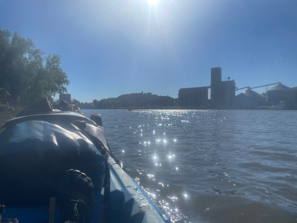 We got to Red Wing at 9:30am. It was a beautiful scene, like a real life version of midwestern Sim City. There were barges being loaded from grain silos. There were kids fishing from a bridge. There were people walking and running along a riverside path. There was a cluster of houseboats making up a small contingent of the Red Wing population, having coffee on the backs of their boats. We moved on and passed a row of small yachts with retirement type names: Wright Timing, Dream Come True, Hydro Therapy… there was one called Mystery Box from Hager City that was intriguing. I’ve had lots of mysterious happenings on this journey, and I thought I should hop on the dock to see what mysteries were in store here, but not seeing anyone I moved on.