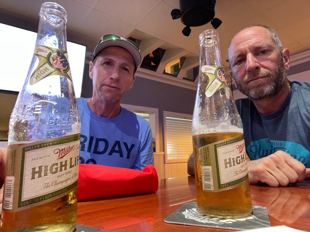 Mark was mentally and physically done. I’d never seen him so angry/crabby in my life. What happened to Mr. Positive? We passed on the available showers and instead put on some dry clothes and after setting up tents, headed to Kelly’s for dinner.