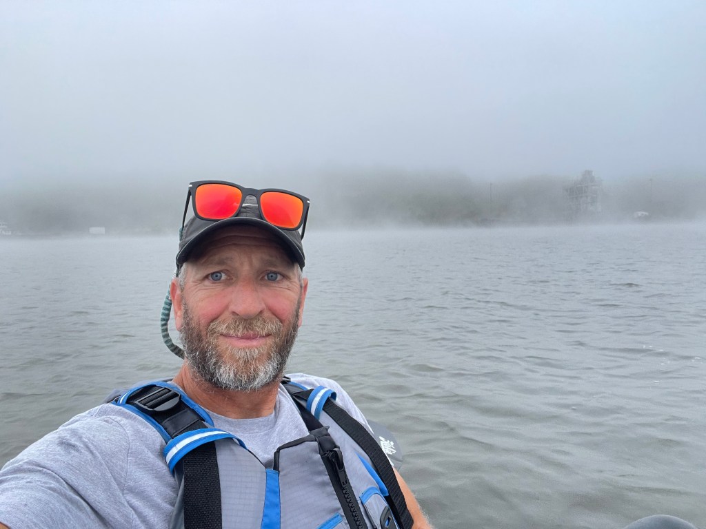 The fog we experienced with Caroline had returned. Though unlike with Caroline when it burned off about a mile after launching, this fog thickened as I went and stuck around for 4-5 miles. I knew the main channel was on the other side of the river, so I should be out of barge traffic lanes, but I couldn’t see a single buoy. I went on for an hour, and still no indicators as to where I was. Though I was confident I was heading south and unconcerned about other boats, the 50’ visibility was starting to be tiresome. Just before 8am, the fog began to break up; there was a slight westerly breeze that made the vapor dash along like some river specters in a long distance race for the sun.
