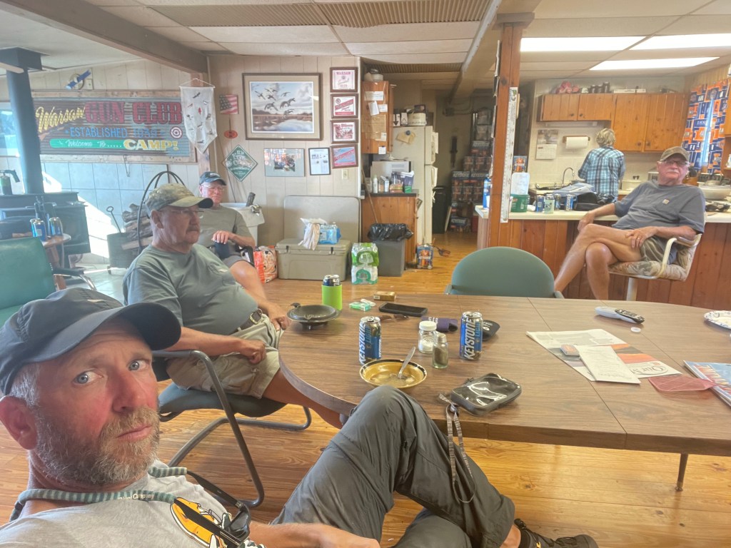 As I started to bring my bags up the bank again, a guy pulled up from the upstream side on a small 4-wheeler. “I must’ve just missed you as you came by!” Well, I explained I was just coming from downstream in a failed attempt to find the Warsaw Gun Club. “Oh, who told you about that?” I explained my meeting with Craig. He introduced himself as “Ducky” and we shook hands. “It’s a real nice place, the gun club. I’m not a member but my boss is. They’re good ol’ boys and they’ll show you a good time. And sure they’ll have a few beer for you.” I told him about my failed search for the club and Ducky said “You were right there! Just around that next bend and down a little ways.” He said, “I don’t know how much gas you got left in the tank, but it’s a far cry better than this if you can make it.” Suddenly enlivened by Ducky’s words: pack bags back on boat and launch again!