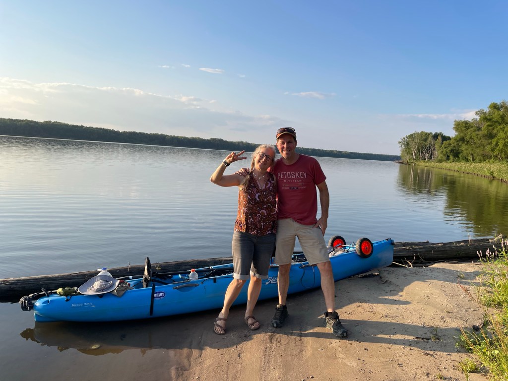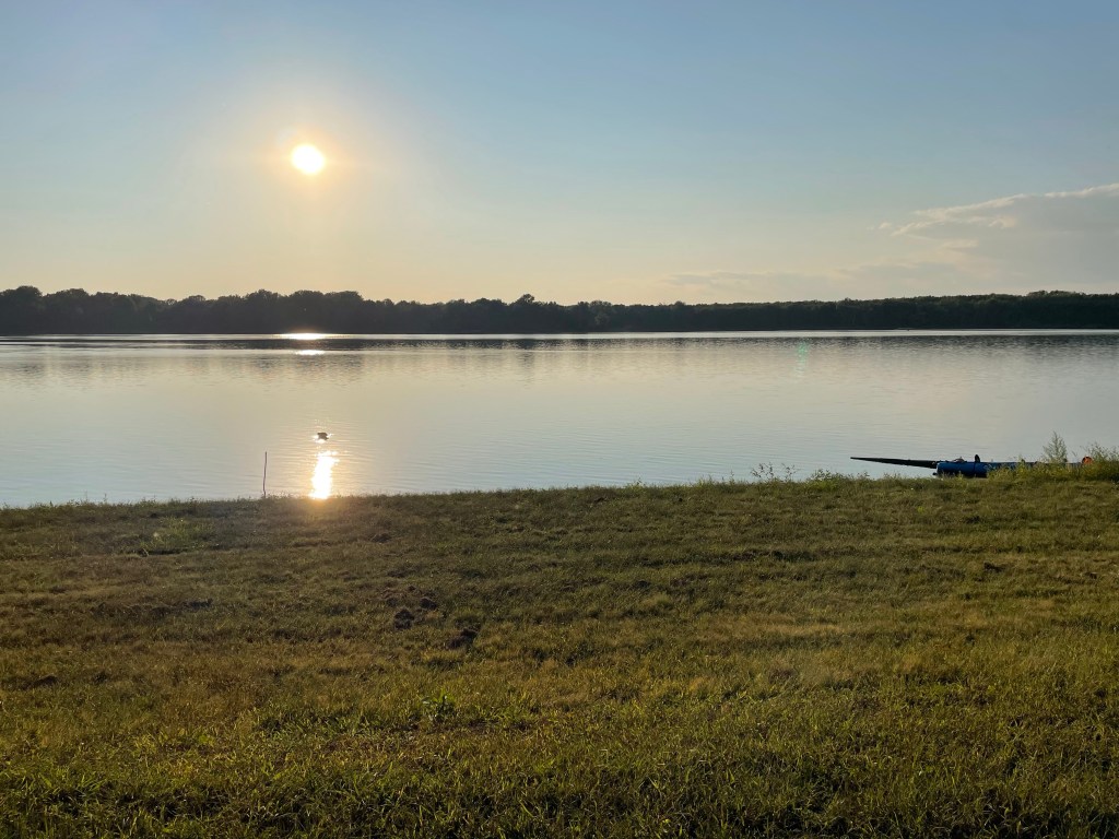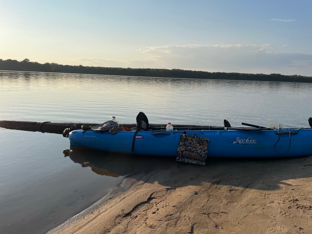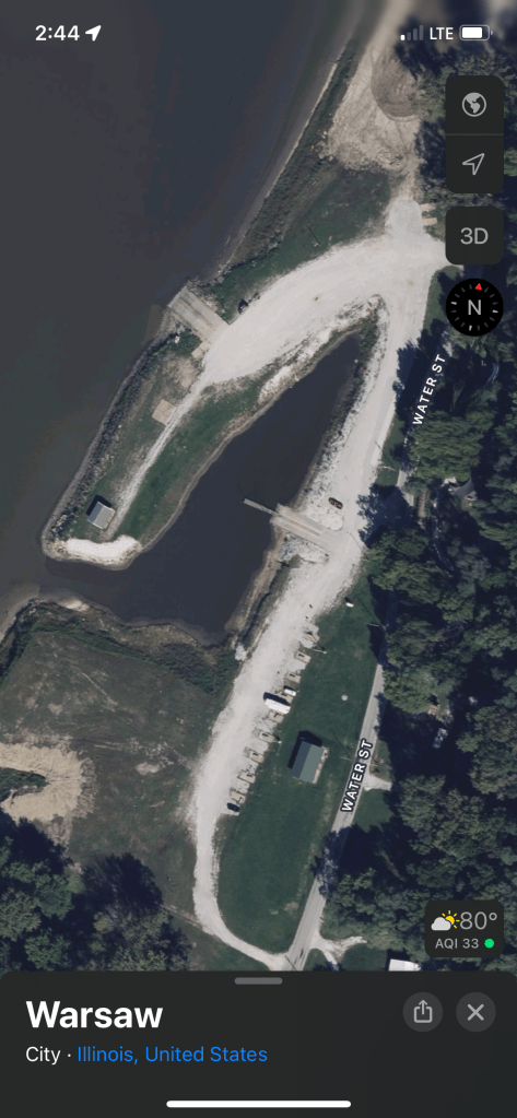 The 20 miles for today passed quickly, too quickly. With my early start I reached my destination before noon. It was getting hot, and I had plenty of blogging to do, but never had I called it a day before PBJ. Also, while visibility and access to the Warsaw Goose Landing municipal park were great, this one rated an 11 on the crappiest campground scale. (I can’t believe I didn’t get a photo!) There were 8 uneven gravel pads, each with a picnic table covered with bird droppings. There wasn’t a single tree, but there were two unmatched large streetlights overhead. It was daytime, but I imagined the newer light would light up the entire facility with blinding white, while the other would glow pale yellow and produce a loud hum all night. All the sites were unoccupied, and I imagined this was the case every night, all year. There was a rusty old barrette, one black Croc, and a pile of charcoal briquettes that indicated some humans had been here since the invention of Crocs, but that was hardly reassuring. I lugged my bags from the kayak to what I thought was the most level of the 8 gravel spots. Then, I did a little blog catch up, ate PBJ and pondered my camping existence. My friends Dean & Cindy Fry were going to be passing through later today, so at least I had dinner with them to look forward to even if the campground is depressing.