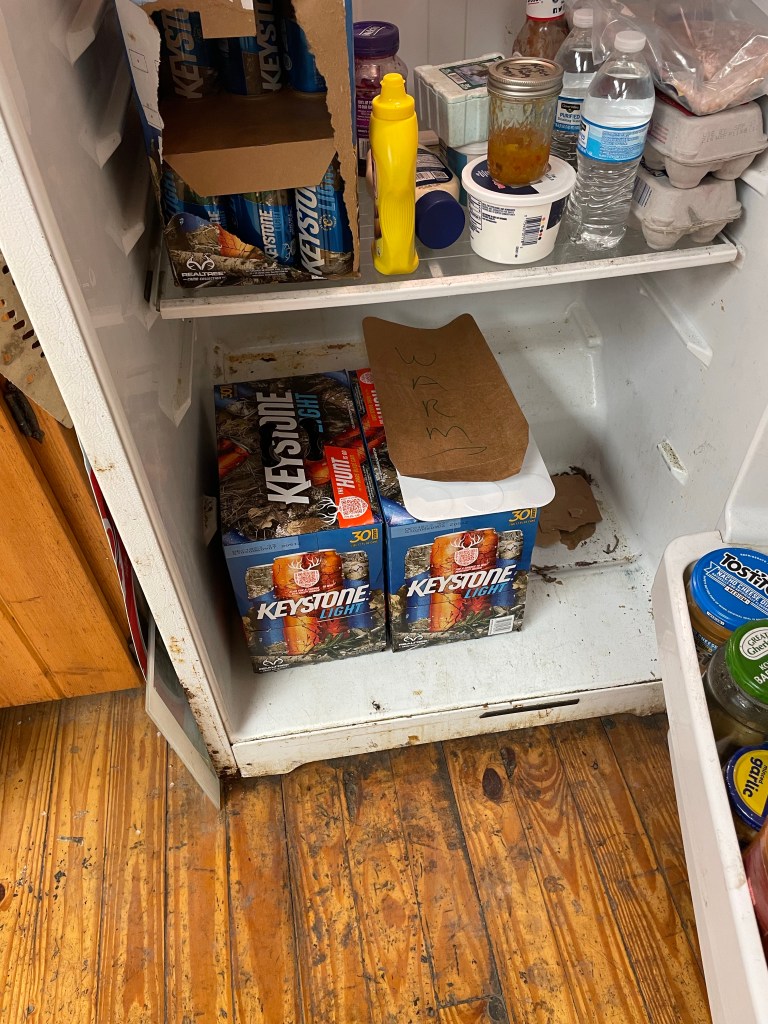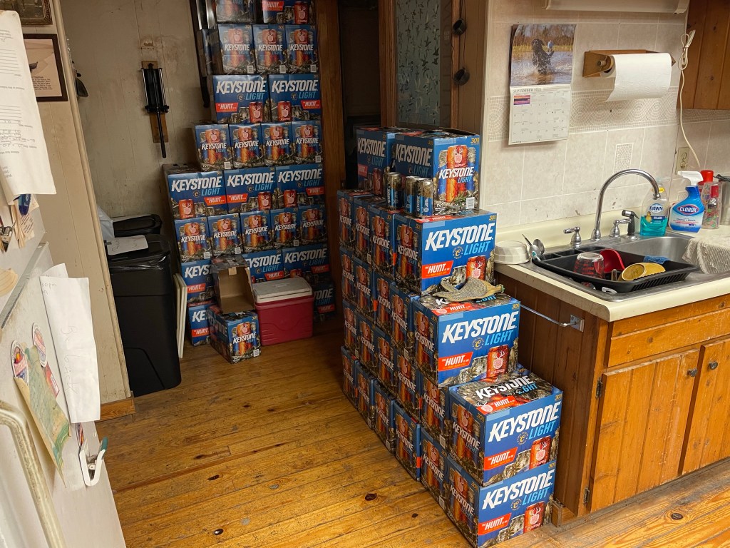 I decided to ascend the stairs and enter the club. On opening the door, I was greeted by a wall of Keystone Light 30 packs: some sort of bunker to shelter from enemy sniper on the levee? I’ve never been to a gun club; I don’t know what kind of things transpire here. Why would they need these walls of beers if not for some kind of protective defense?