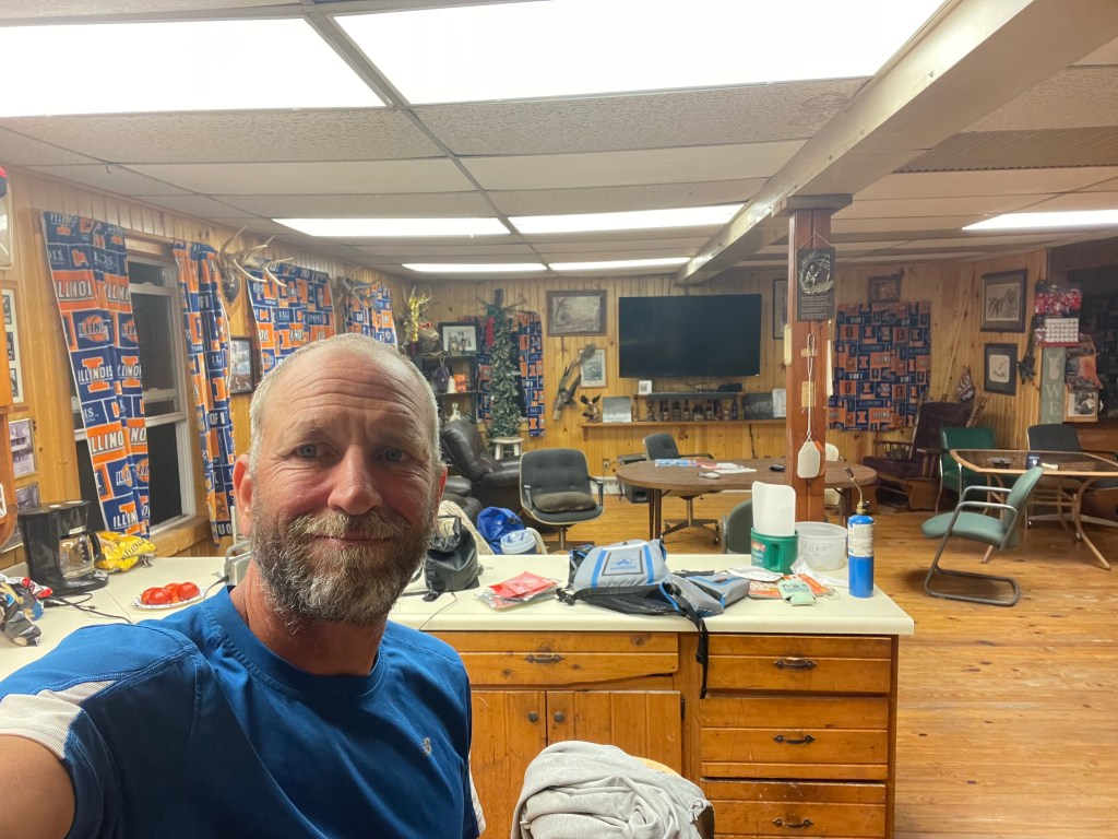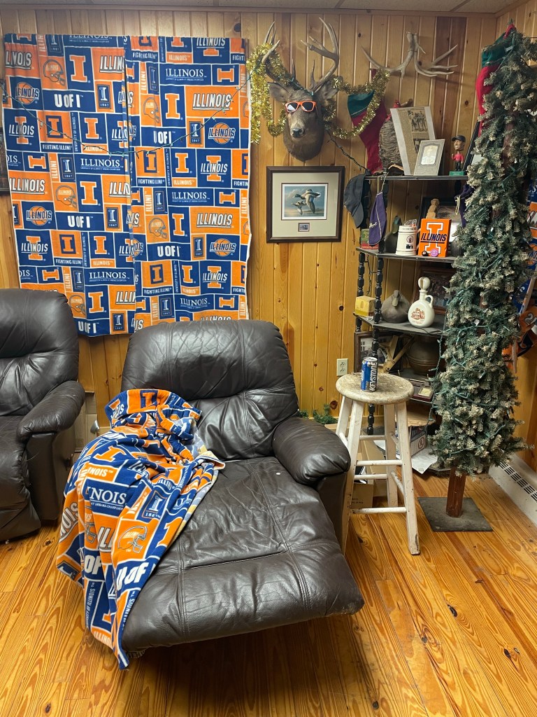I borrowed a fleece Illini drapery for use as a blanket. Then I sat down to attempt catch up on the blog. But, it was late, I again wanted an early start tomorrow, and the recliner was working its magic on my consciousness.