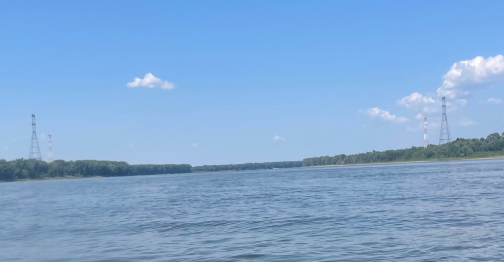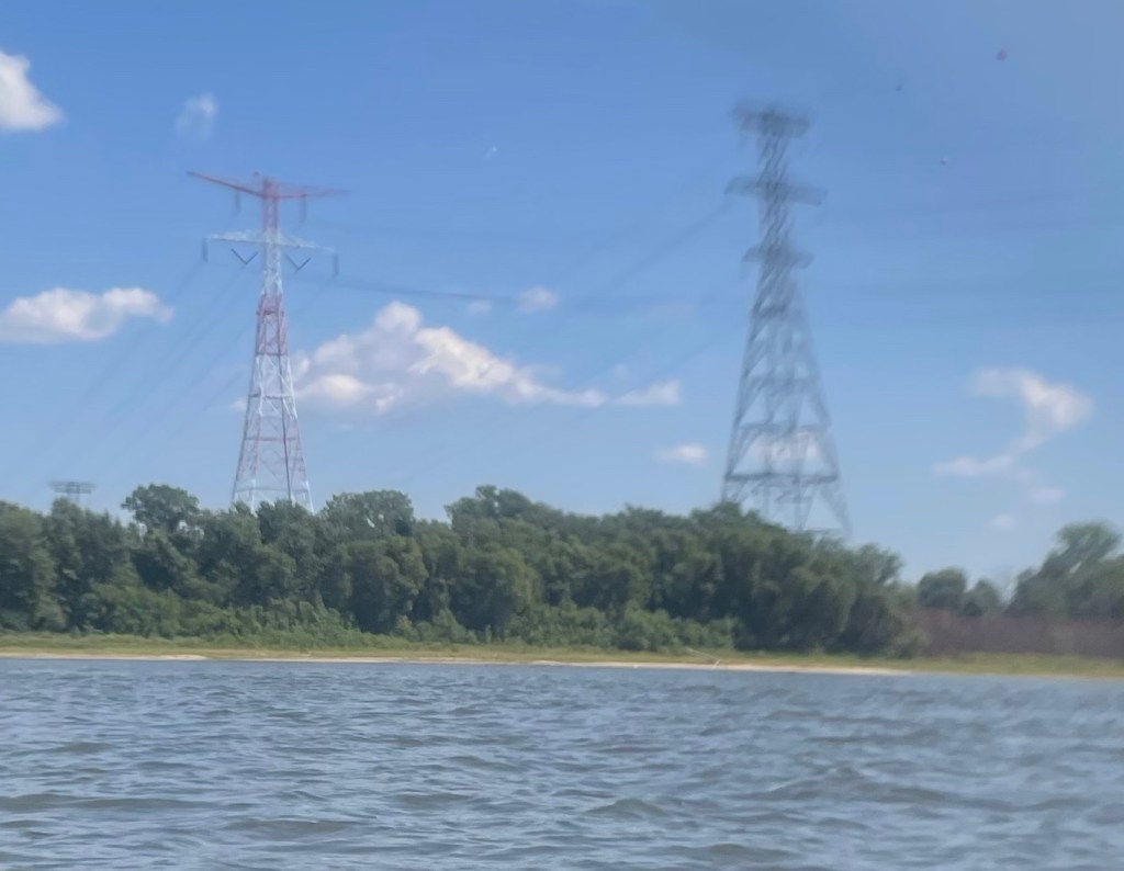 After Quincy, thing were pretty quiet and warm. There really wasn’t much around and I saw no people, at least not humans. I did come across a couple of giant male and female structure people who held up some electrical transmission lines for me. The guys dressed in drab gray seemed to hold their lines up with their ear lobes, their hands, and some pointed wide belts around their waists. The females held theirs with their ear lobes, hands, and other points of their own, sittin’ way up high. I imagined what would happen if they decided to drop the lines as I passed; I suppose every fish within 100’ miles would come floating to the surface but I would be insulated from the electrical charge by my plastic craft! I would rather not paddle through a lake of dead fish, so I thanked the structures aloud as I passed below.