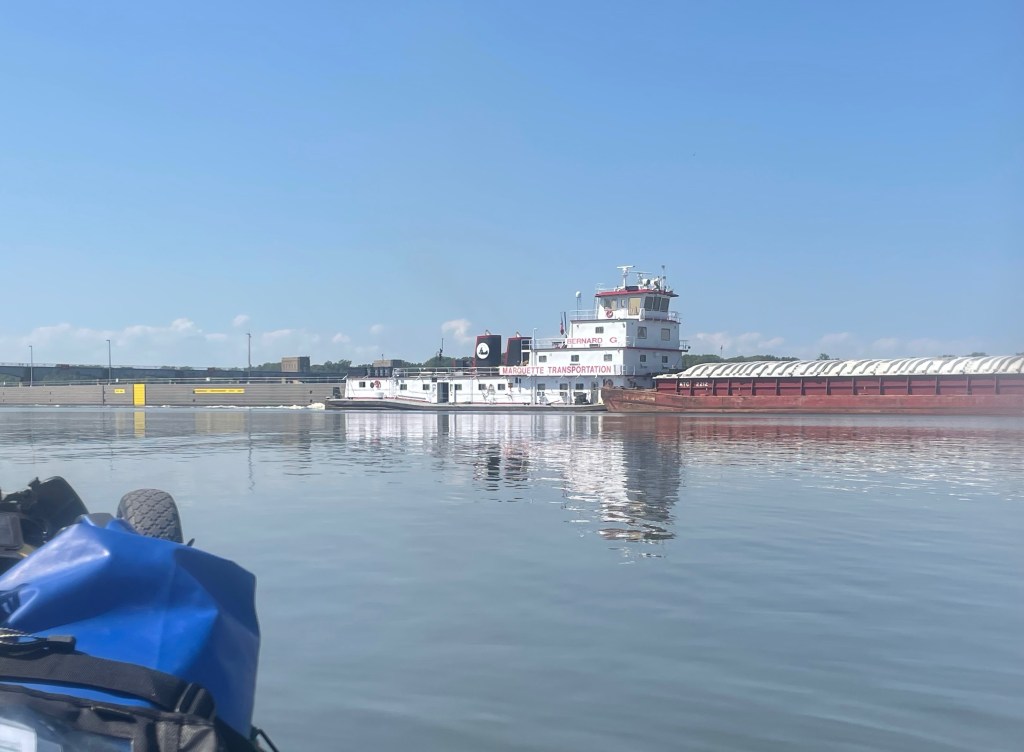 Shortly afterwards as I came into Quincy and passed under the Hwy 24 bridge, a truck driver with Hegleman lines gave me a wave and a honk. I had a sense that everyone was on my side today, the whole world was collectively wishing me well, and I felt extra motivation and purpose. At lock & dam #21 I ran into my first congestion with barge traffic; I had to wait an hour for the Bernard G to pass pushing 15 loaded grain barges. Going through, as usual, the lock operators were interested to hear about my journey.