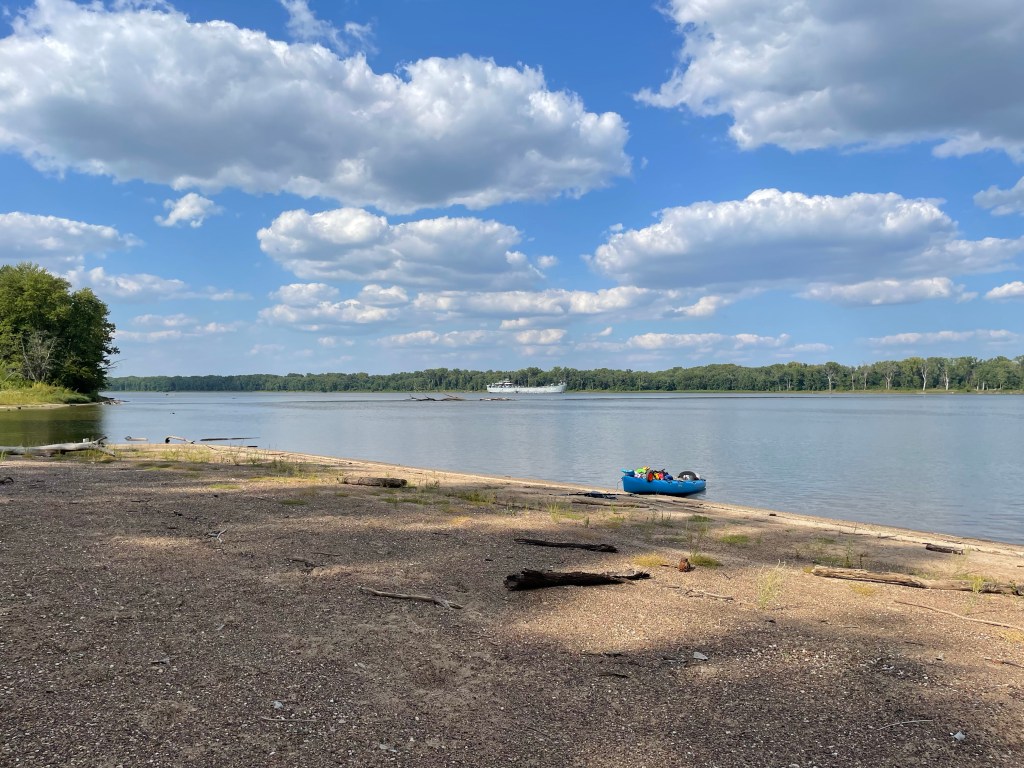 As I approached Whitney Island, I decided I’d traveled enough for the day; any further and I would start approaching closely to Hannibal. So I pulled in and was glad to have some quiet time on the uninhabited island for the afternoon. I did see a solitary river otter swimming nearby, but otherwise there was not much happening. I sat on a log and started to blog (there’s a Dr. Seuss line in there somewhere… this one likes to blog; he blogs on a log with his hog in the fog…) 30 minutes after I set up camp, the LSR 325 passed by. I was hoping for a little honk and a wave, but they didn’t acknowledge me – some thanks for all I’ve done for them.