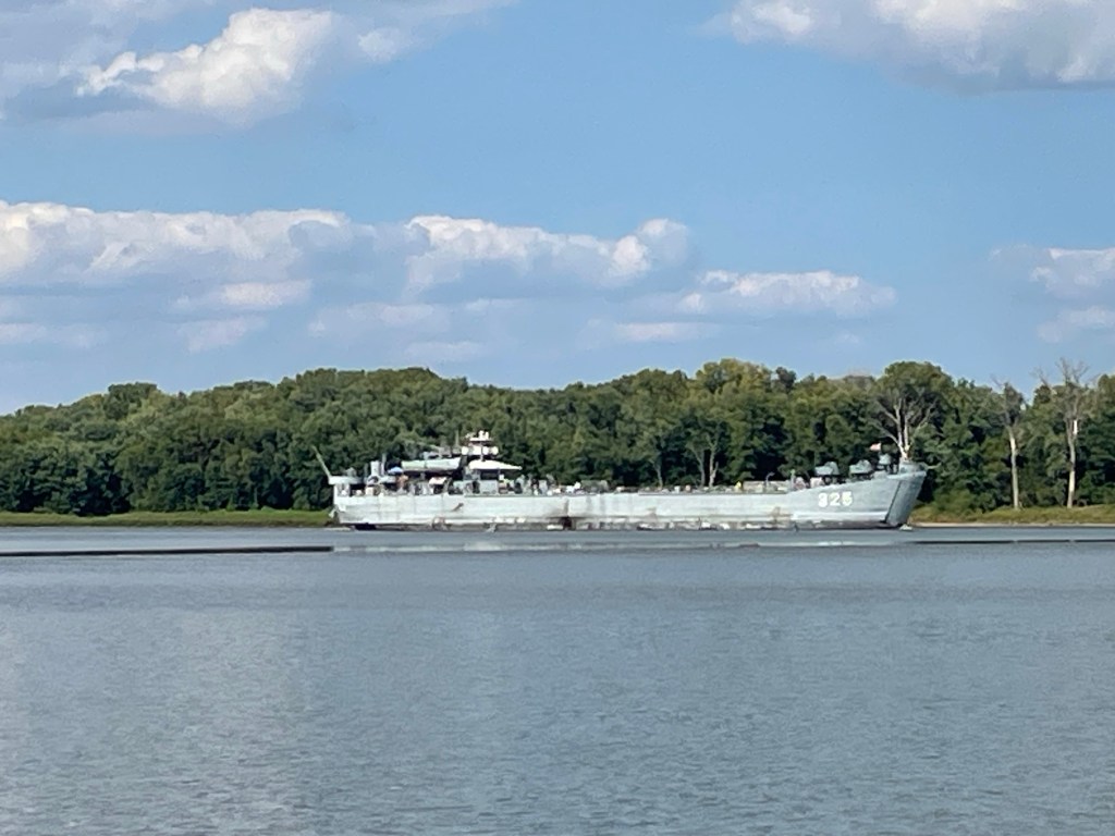 As I was waiting in the lock chamber a woman called down from above, “Have you seen my ship?” “Which one?” I asked. “The LSR 325 from Evansville.” It turns out she was part of the crew giving tours of the Navy ship and she was traveling with a friend by car to its next port. I told her I hadn’t seen it since Dubuque; she said it was in the next lock upstream and headed this way. There was some mention about protection me while I traveled downstream, or is it the other way around? I think the folks on the destroyer are glad to have Leechman’s protection. After all, there have been no Catwoman capers in Cassville, no Mr. Freeze felonies in Ferryville, no Two-face terrorism in Trempeleau, no Green Goblin gone awry in Guttenberg – Leechman’s wake is free of supervillains so I’m sure the LSR 325 feels safe following me along. Jim Gaffigan whiny voice, “Wait a minute, did he just combine Marvel and DC supervillains? Real superheroes can’t do that! This guys a complete fake.”