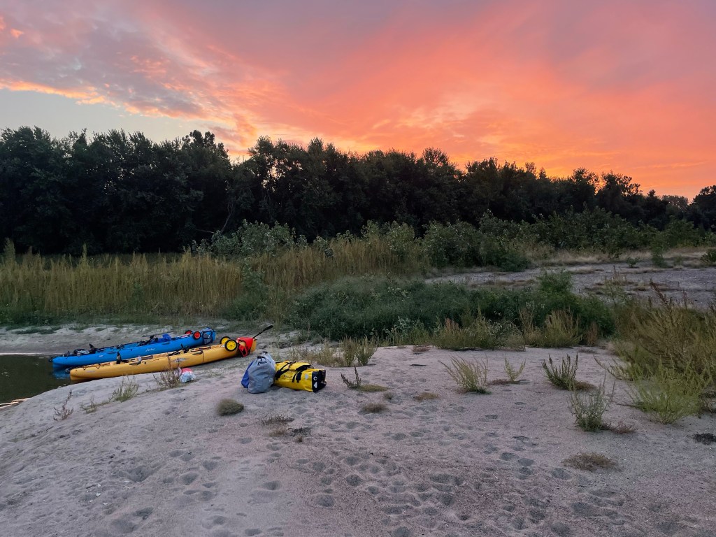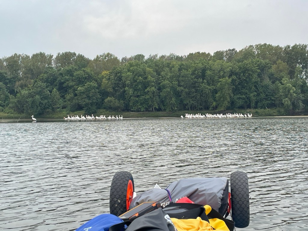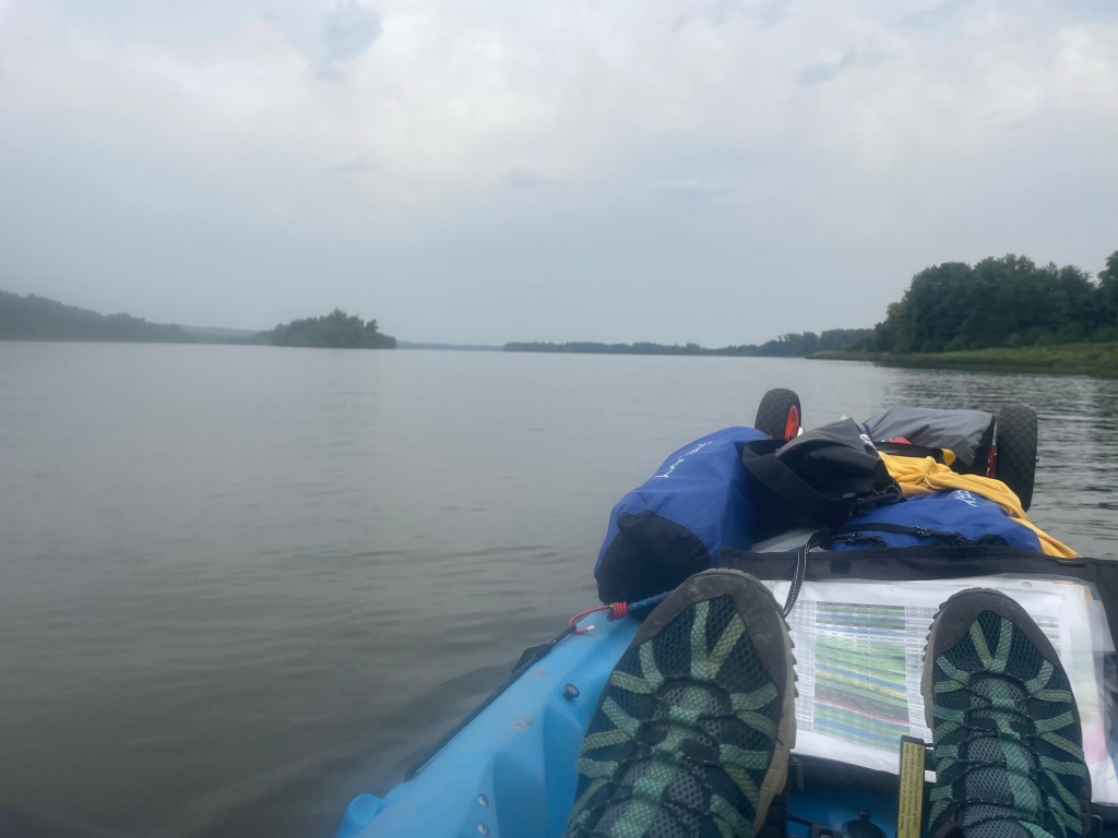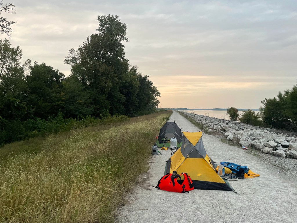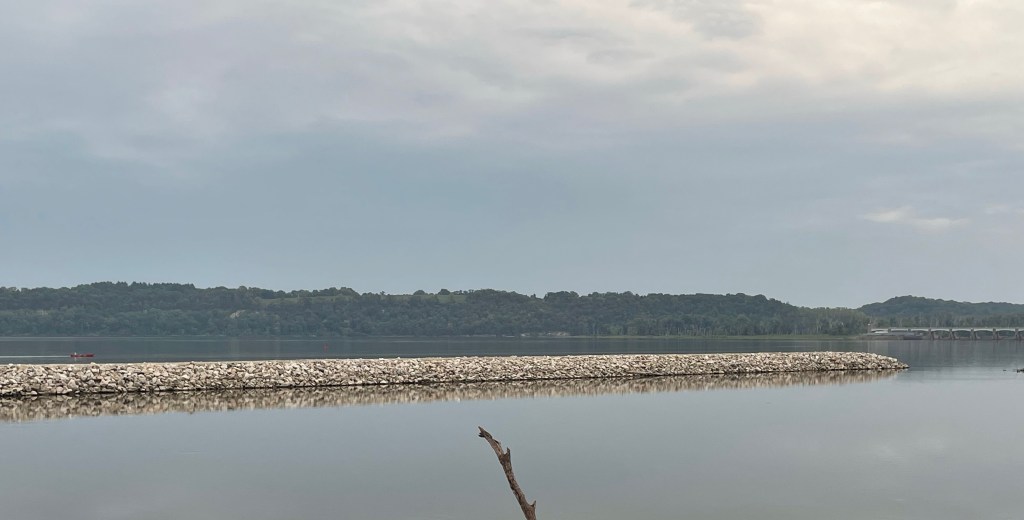 Back on the water we took a few shortcuts through channels to cut the mileage from the circuitous main channel. We found calm water, no sign of people and shaved off some distance. We didn’t think we had time to make it to the next lock before dark, so we started looking for a camp (about 5 minutes after passing a dedicated canoe paddle camp). All of the great sandbar options we had seen earlier were now nowhere in the vicinity. We kept paddling and searching, until finally the next dam came into sight. We thought about locking through tonight, but it was already after 5:00; it would be close to 6:00 if we locked through then found camp downstream. So, we “stealth camped” in the wide open on a crushed limestone path by the dam.