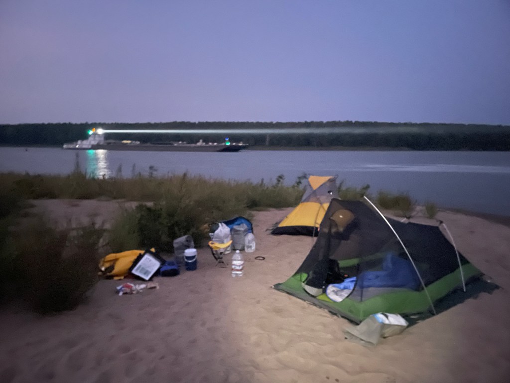I awoke around 5:15 in complete darkness. There was only the light of a barge tow a mile or so downriver that was parked there with engines idling most of the night. I suppose they didn’t want to navigate lock #24 in the dark, so like us they were planning to strike out at first light. I made coffee and instant oats by the light of the headlamp, then we prepared to breakdown camp.