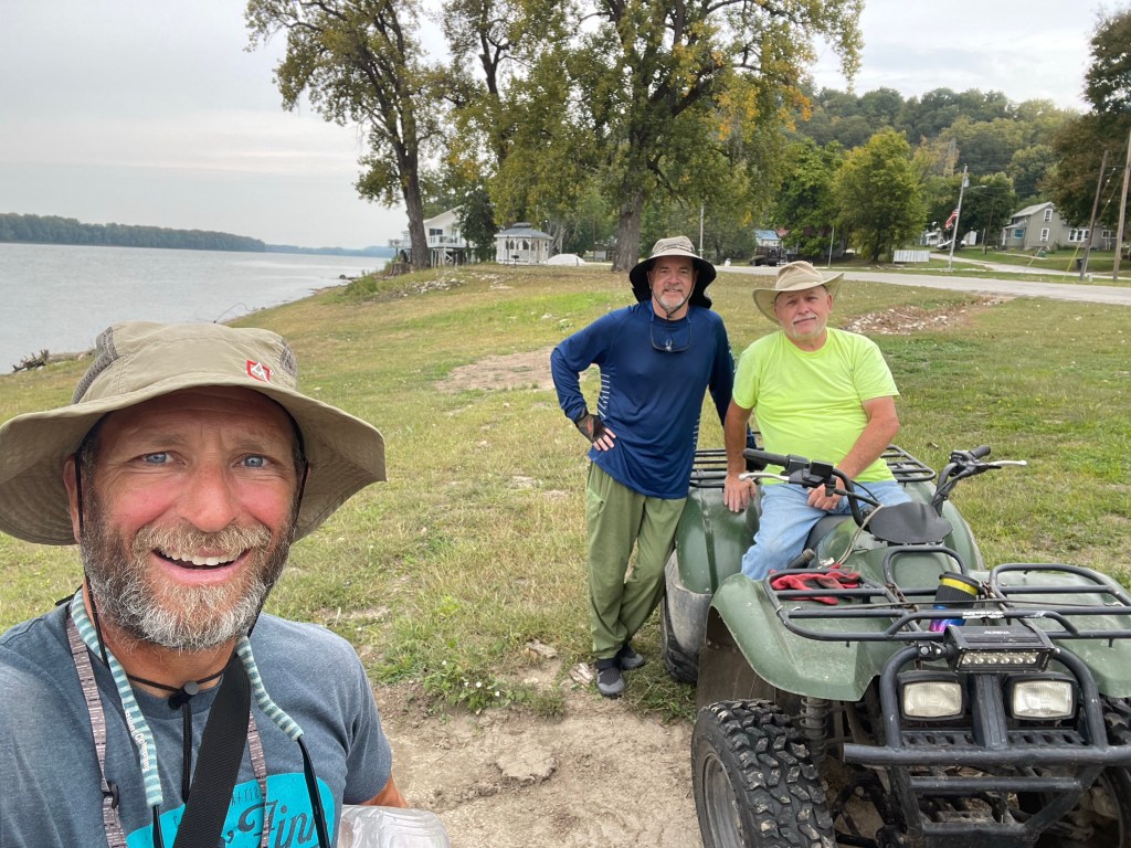 When we started the day we were down to about 1.5 gallons of water (from our 6 gallon inventory). We could get through the day on that amount, but it wouldn’t get us through breakfast tomorrow, so we wanted to find a supply. Due to the scarcity of towns along this stretch, the only likely option for water today was at the village of Hamburg, Illinois. We pulled in at the village riverfront park and got our empty water containers off the boat. Suddenly, the mayor showed up on his Kawasaki 4-wheeler.