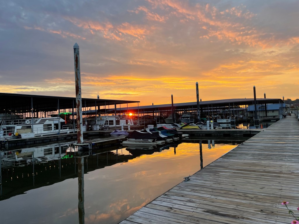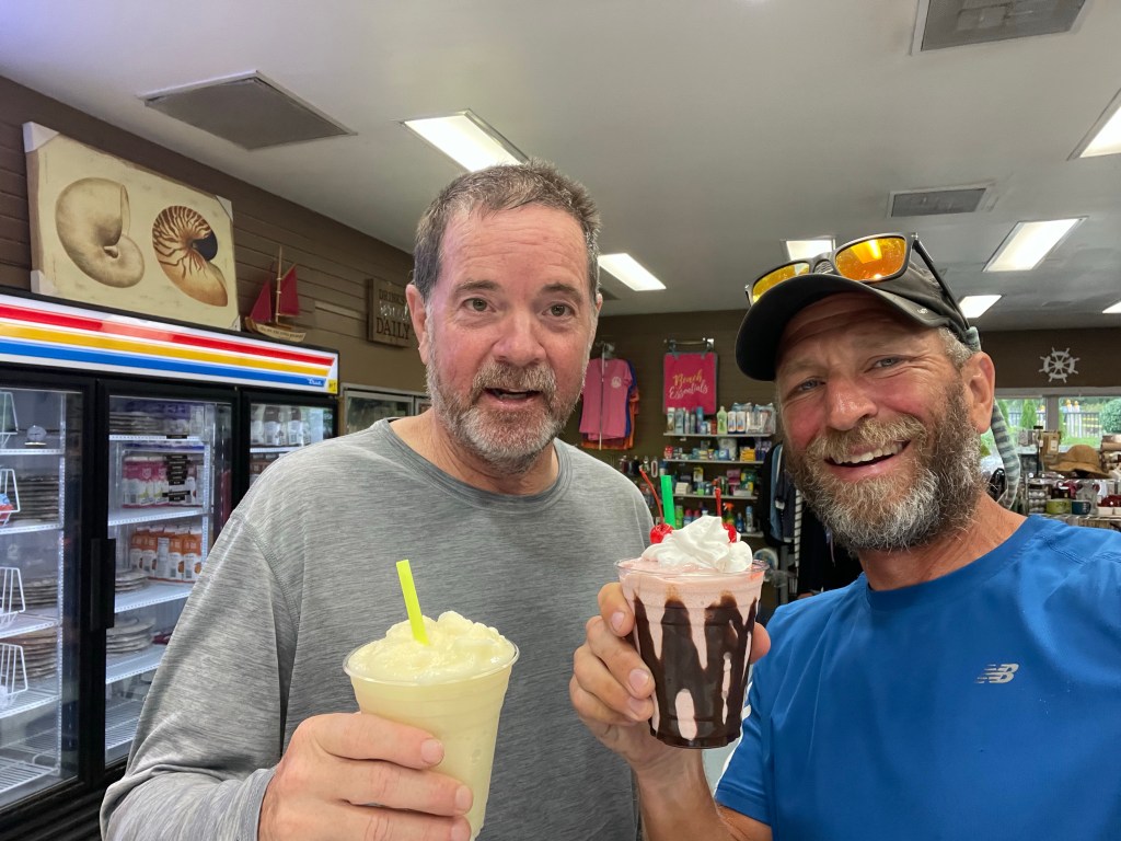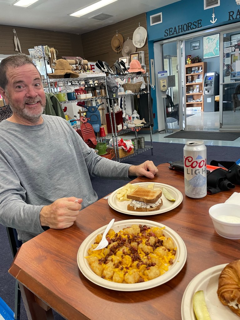 At the marina we paid for our stay then visited the restaurant/gift shop on site. We decided to defer lesson #1 for a bit (immediately change into dry pants and socks) so we could dine casually before they closed. Although they had PBJ on the menu, we opted for chicken salad sandwiches, loaded tots, and frozen drinks for dessert. We’re still burning a lot of calories, so intake is crucial.