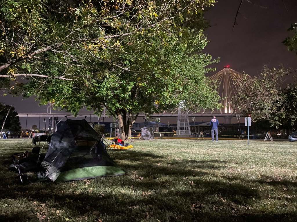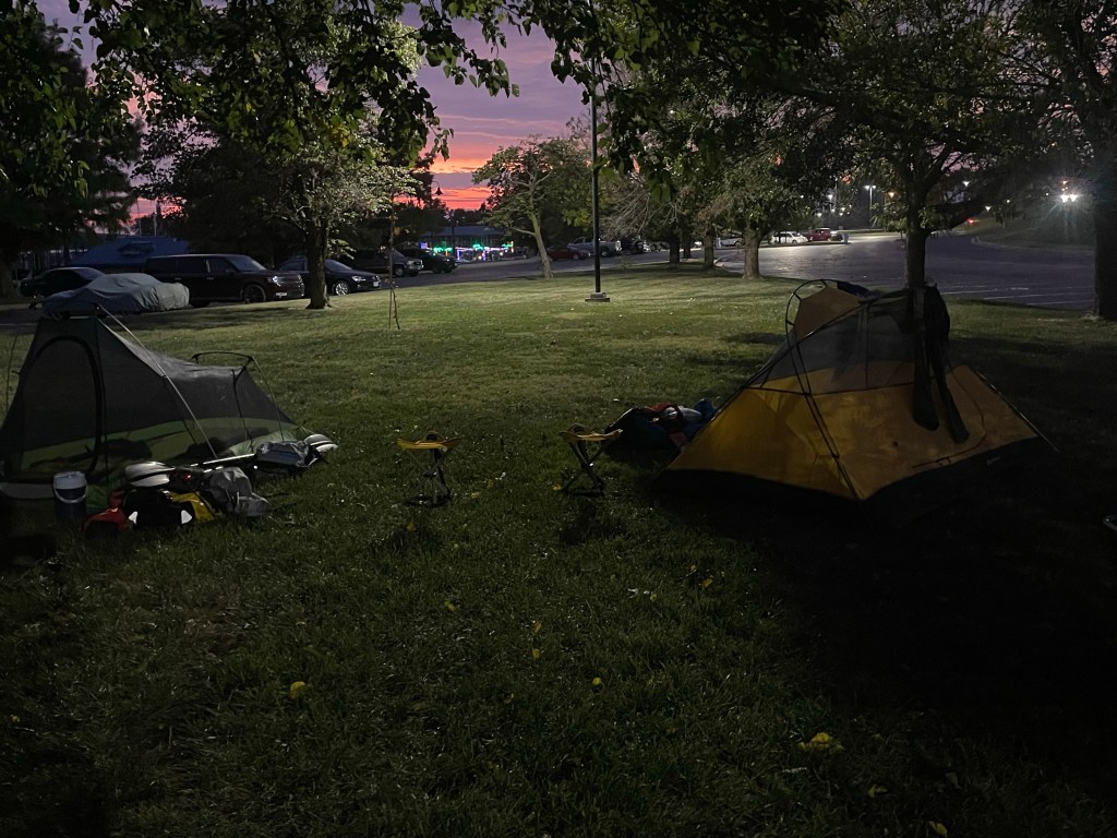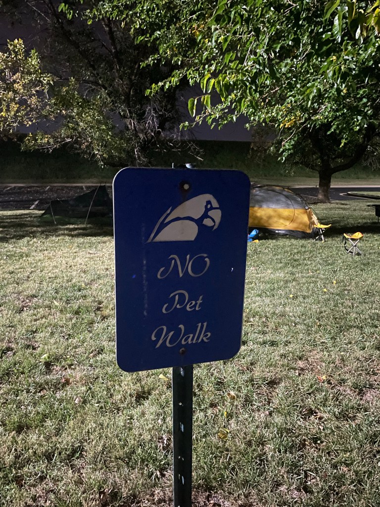 After dinner we set up on the lawn in the parking area at the marina. A sign indicated the area to be pet-free, but I nearly set up my tent on top of a large pet deposit. The ground was nice: it was good to be on soft grass and free of sand for a night. However the scrappy trees provided not quite enough shade from the halogen lights overhead.