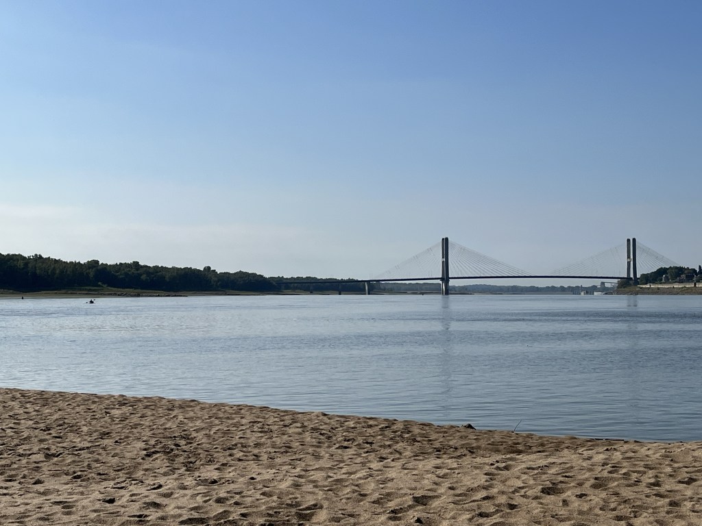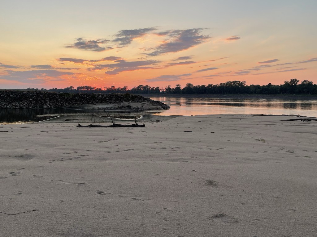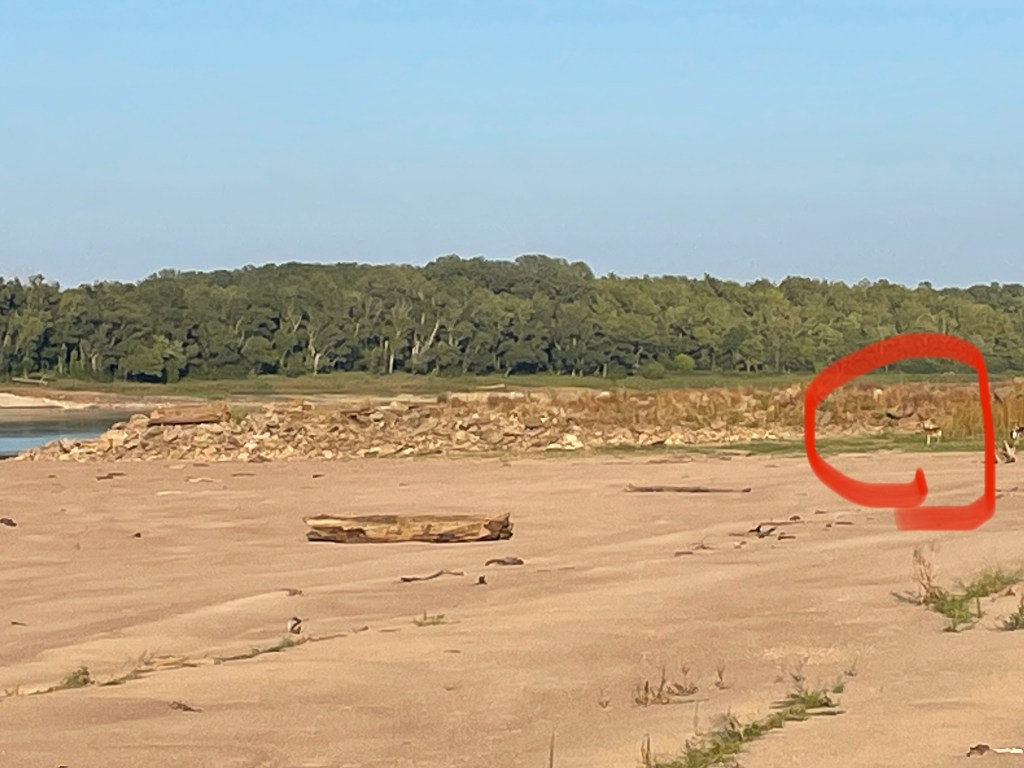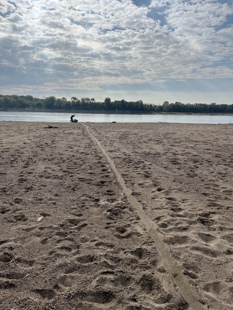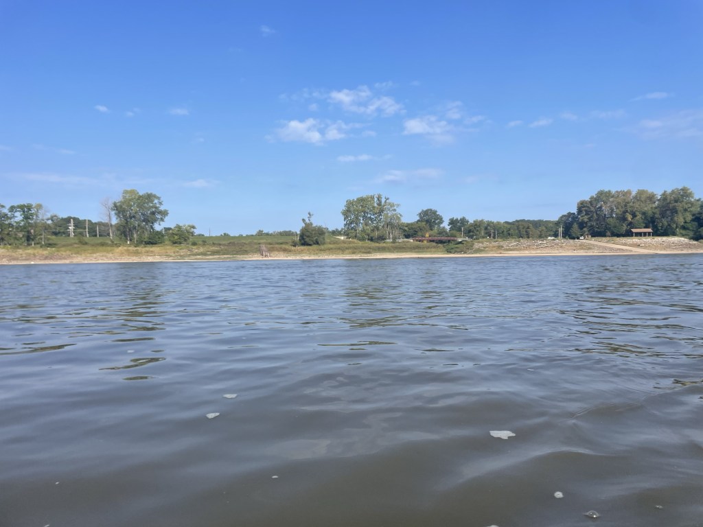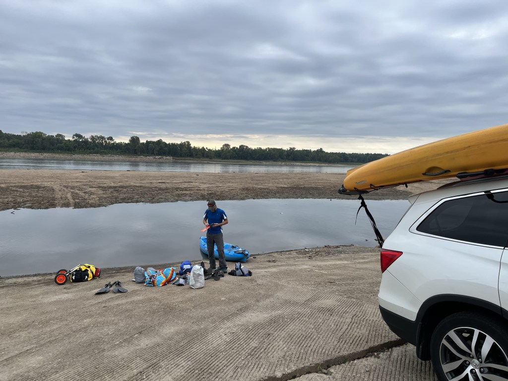 The goal today was to be on the water at 9:30, and get to where I get to. With the low water and no more dams, sandy beaches seem easy to find, so I’m expecting premium stealth camps around every bend. However, I wasn’t expecting a sandy island in front of the Cape Girardeau boat ramp! What a hassle. Christin helped me load the boat, then I paddled fifty feet, unloaded the boat, dragged it with Christin about 200 feet to the actual river, then reloaded and launched for real. It always seems a pain coming off the river; except in Memphis I don’t plan to do it again.