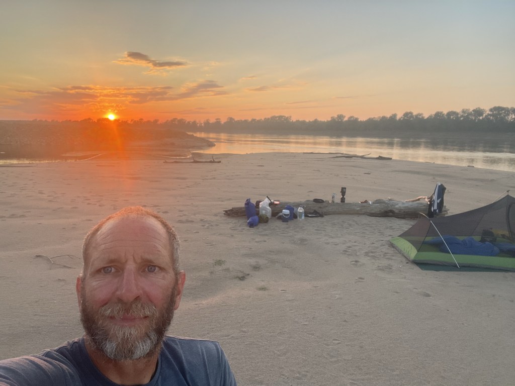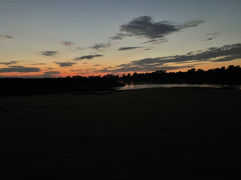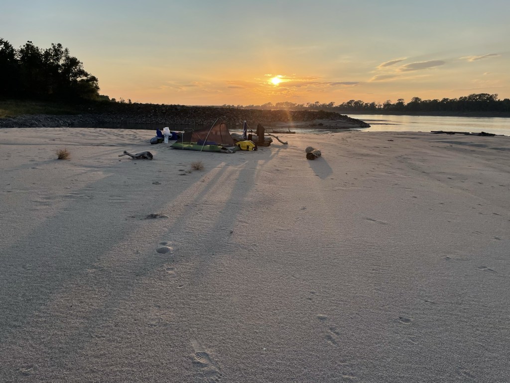 I spent the rest of the day enjoying the flow and thinking piratey thoughts. Around 5:30 I pulled up to what was once an island, but with low water it was now a small peninsula; it seemed a great place for stealth camp. There were 3 deer on the beach that didn’t appear happy to see me. They made some snorting/whistling noises as they looked me over and bounded away into the woods. I was kinda glad to have heard this noise and understand it’s source because I had heard this sound one previous night while I was laying in my tent; now I know this sound is just deer profanity and I need not be concerned if it happens again in the middle of the night. Though this also sounded similar to the sounds from Room #1 at the Burlington Hotel, I think I should be able to tell the difference in the future based on situational circumstances.