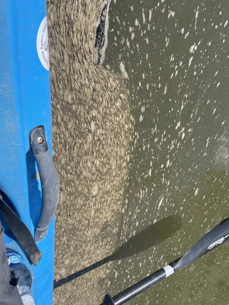 And speaking of river pace… I hate the Ohio River. This thing came into a fast flowing Mississippi and bogged it down. Immediately at the joining the Mississippi became many times wider and seemed to be going nowhere. As I told Dick Dastardly on this stretch, the river at the confluence is stagnant, smells like dead fish and buzzes with flies. And talk about an alarming Asian carp population! That was the only sign of wildlife. Though if I would’ve had my Merlin bird app functioning it would’ve picked up some Rohde Island Red or Barnevelder clucking somewhere behind the trees on the Missouri bank. To add a bit more insult, during my floating lunch break here the wind blew in my face and started piling green-gray gunk from the river’s surface into a thick collection next to my boat. I’m not sure if I’ve experienced a worse scene on this journey.