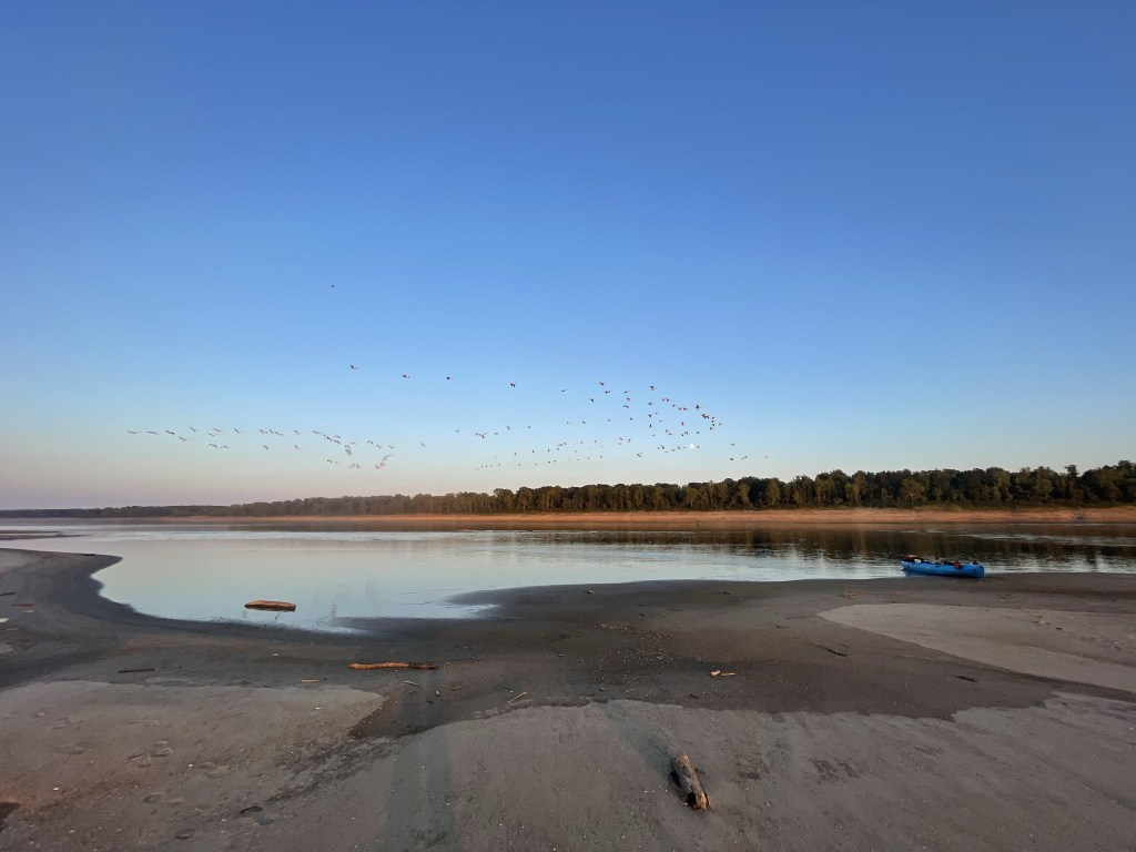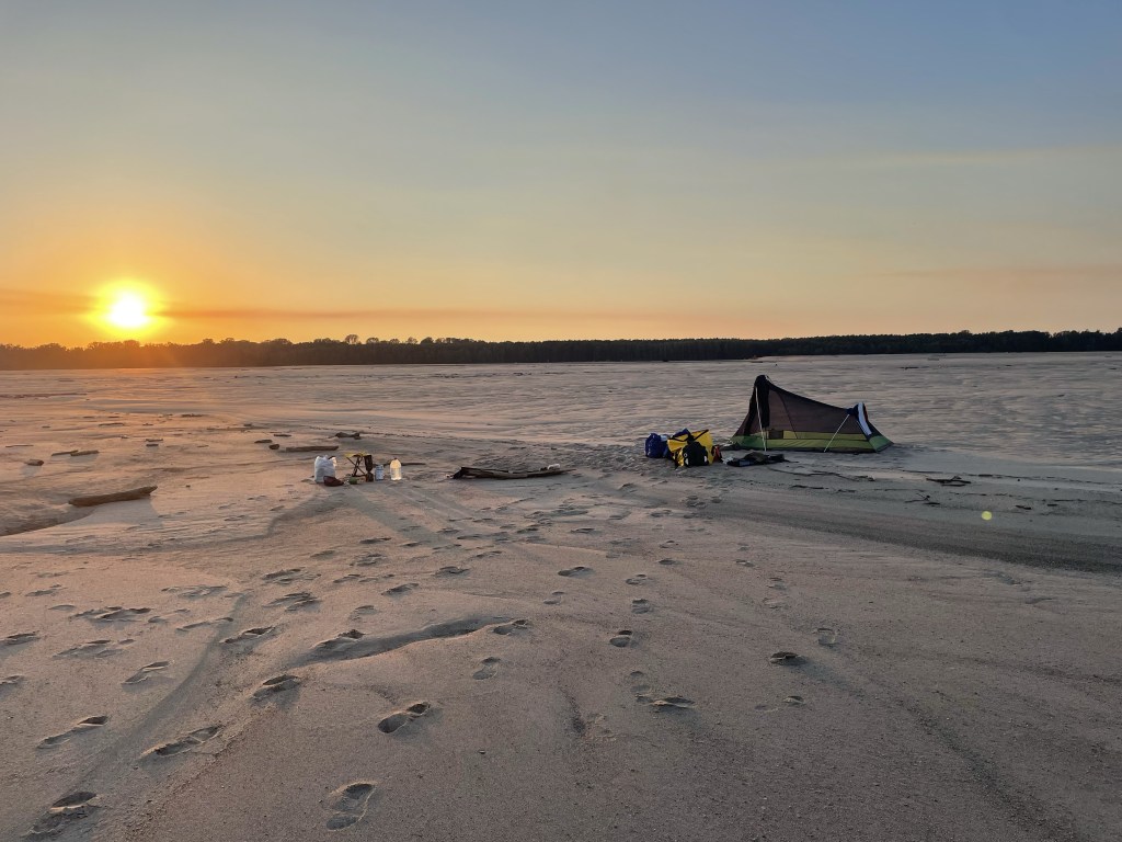 Around 6 pm I settled down on a very large expanse of beach near Hickman Kentucky; it was the kind I’m now looking for, where trees and coyotes are several stone’s throws away. I did see what looked like a lone coyote track across my beach, but I was comfortable being distanced from the woods.
