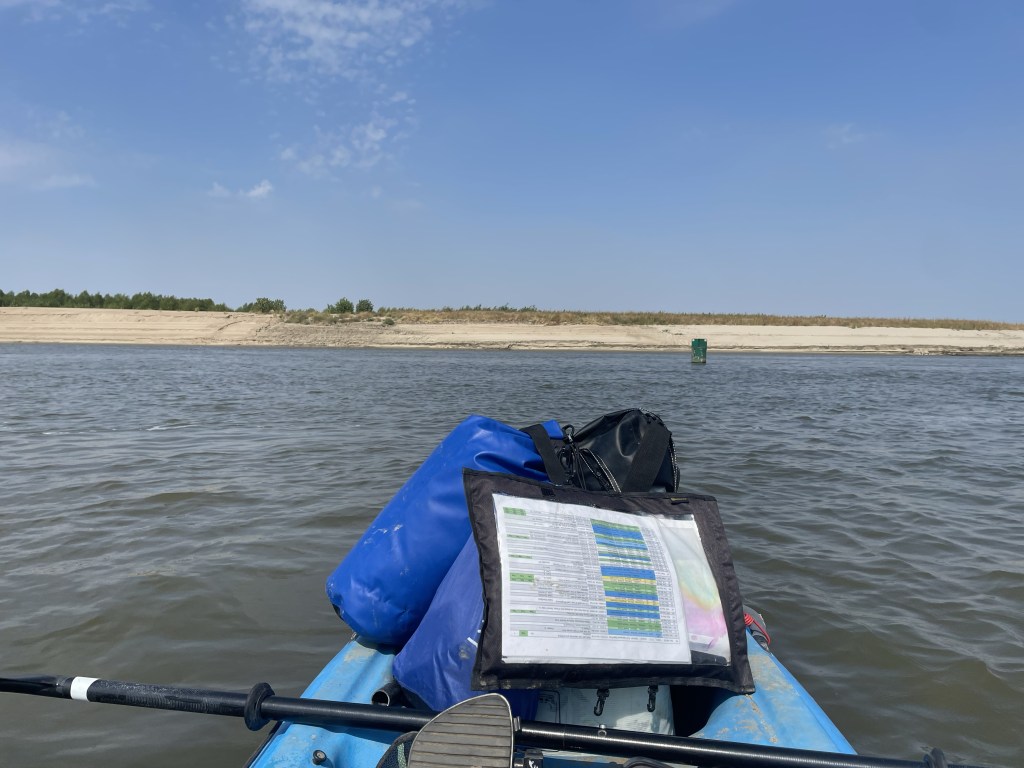 Shortly afterwards came the 50 mile deal breaker: wind, heat and sporadic flow. With the twists in the river at this stage, I’m basically going 3 miles east, big right turn towards south, then 3 miles west, big left turn toward south, and keep repeating: east-south-west-south-east-south-west… The wind was predicted out of the east, but somehow it was in my face all day. I’d like to find someone that can explain this to me sometime. And the flow is also sometimes illogical; I’ll pass one buoy that’s bouncing and swaying as the current tries to tear it from its mooring, then the next buoy looks like it’s sitting in a stagnant pool. I understand the times when the river gets to be a mile or more wide and the spread slows it down, but that wasn’t always the case when the flow abated.