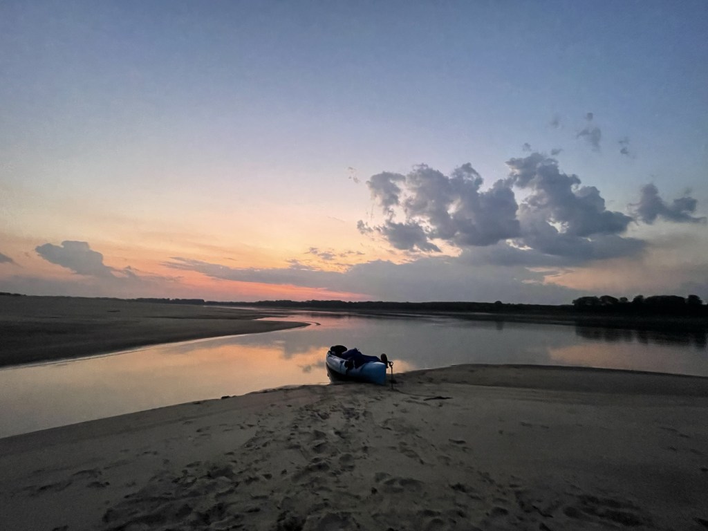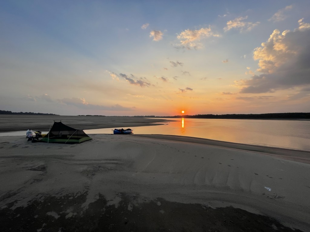 Anyway, these conditions are having me go through 2 gallons of water per day: double my planned allotment. So today I stopped in Caruthersville Missouri to fill up 2 gallons. This is the saddest town I’ve seen on this trip, maybe one of the saddest ever. There were two pickup trucks by the boat launch: one contained an elderly woman with a disposable mask, and the other had a guy that was the humanization of Ned Flanders. They were both just staring out their windshields at the river, Billy Stoneking style. Another guy in a pickup wearing a large Stetson hat was watching some guy knock a golf ball around a big dry patch of grass. There was a park at the boat ramp, but no sign of water or other amenities, so I went to town through the opening in the rusted steel dike wall. I thought there was a small market or convenience store close to the boat launch, but there was only a casino in one direction, and a few businesses in the other; the Casey’s was over a mile away. I thought about marching into the casino and putting my dry bag down, “betting it all on black!” But, that would probably cause some confusion, especially as I look like a homeless man with a life vest.