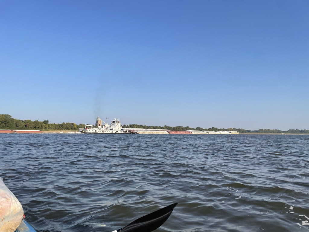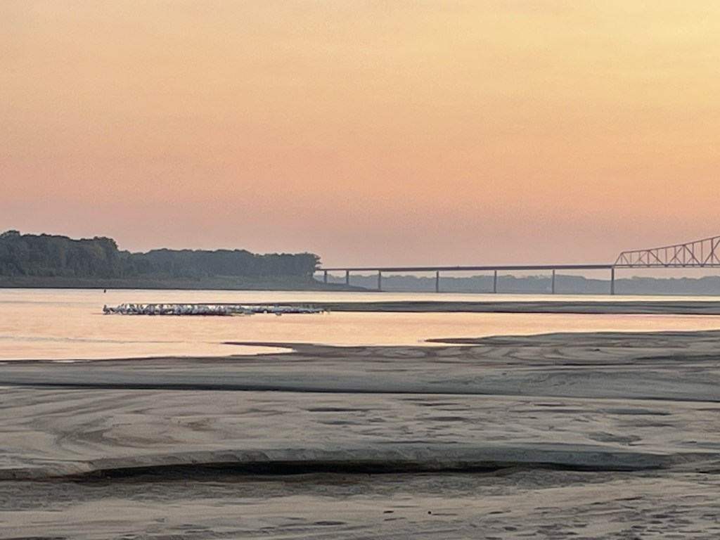 I slept really well last night; the low slope on the beach and frequent barge traffic had waves rolling in most of the night. It does make me want to live next to waves, or at least get one of those wave noise machines. But when I woke this morning I realized, there are no songbirds here. I can’t recall the last time I heard songbirds in the morning. Was it yesterday? The day before? A week ago? Maybe that was the start of the desolation feeling. Similar observations: trains are gone. Remember when tracks lined both banks and crossed overhead periodically? I think it was the day I left Cape Girardeau when I last saw a train. And today I saw more paintbrushes floating in the river than I did bald eagles – one paintbrush. I know I’ve said I’m kinda done with the eagle thing, but suddenly to zero! Unexpected today. Desolation indeed when a paintbrush and two empty egg cartons make the top 10 most exciting things seen today. Oh, and a plastic garbage bag that looked like it was breathing; we avoid those things.