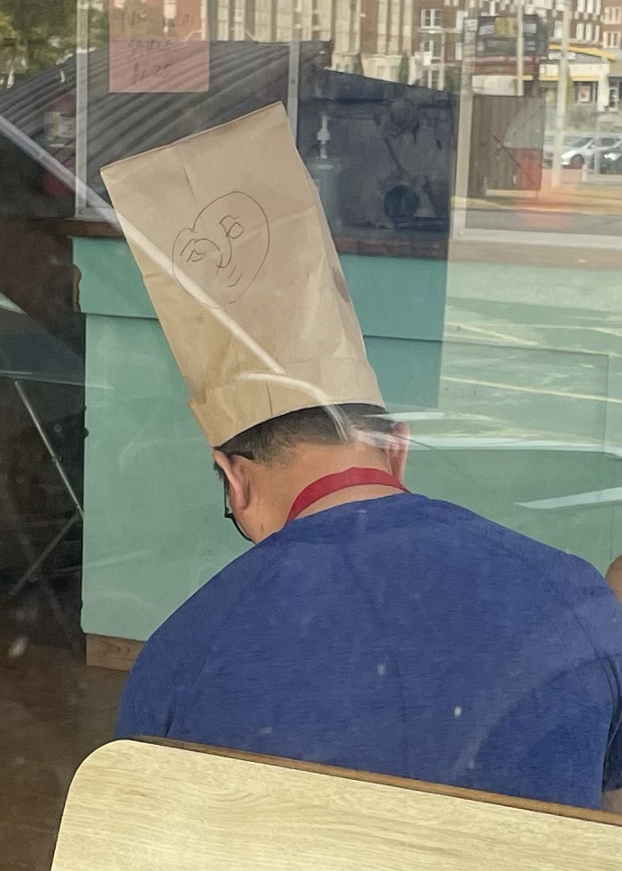 There was a Chinese restaurant a few doors down from the laundry. As I walked past on my return to the hotel I noticed a guy in there wearing a paper bag as a hat. When I looked closer, I noticed there was a face drawn on the back of it; I thought it looked really funny. I went to the side window where he and a woman were sitting; I knocked on the window, pointed to his hat and smiled with a thumbs up approval. He scowled a bit at me and shook his head while the woman gave me a back handed “shooing” motion. I thought, why so mean? He should be a fun guy with that paper bag hat. Then I thought, maybe he lost a bet and has to wear that stupid hat as a result? Or maybe it’s some religion I don’t understand and shouldn’t laugh at? Or, maybe I just look like a crazy hobo who should mind his own business.