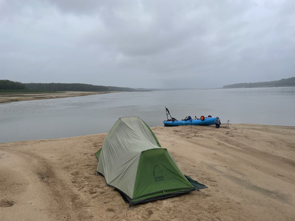 Around 5pm today I was getting tired and had no reason to forge ahead further. So I found a beach on the left bank and pulled up; 44 miles today. I’m camped on a strange little section where the river has moved since state lines were originally formed, so Arkansas is on both sides of the river. Is two nights in a row In Arkansas pushing my luck?