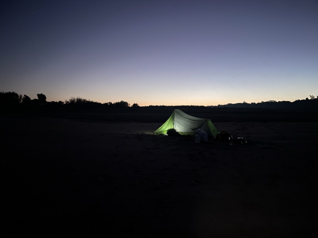 After the gator scare, I ended up stopping after 42 miles (again) on a piece of beach that’s good enough. The woods are close, I already heard the annoyed snort-whistle of a deer. And there’s a light about 2 miles up that also emits a loud “mooop” every 15 seconds; it sorta sounds like a loon. I guess this is to provide a sort of auditory lighthouse signal, maybe to help any blind tugboat captains out there? I’ve certainly stayed in worse spots, as you know, but I’ve been getting sorta spoiled. I think though down this final stretch, really good spots are going to be hard to find.